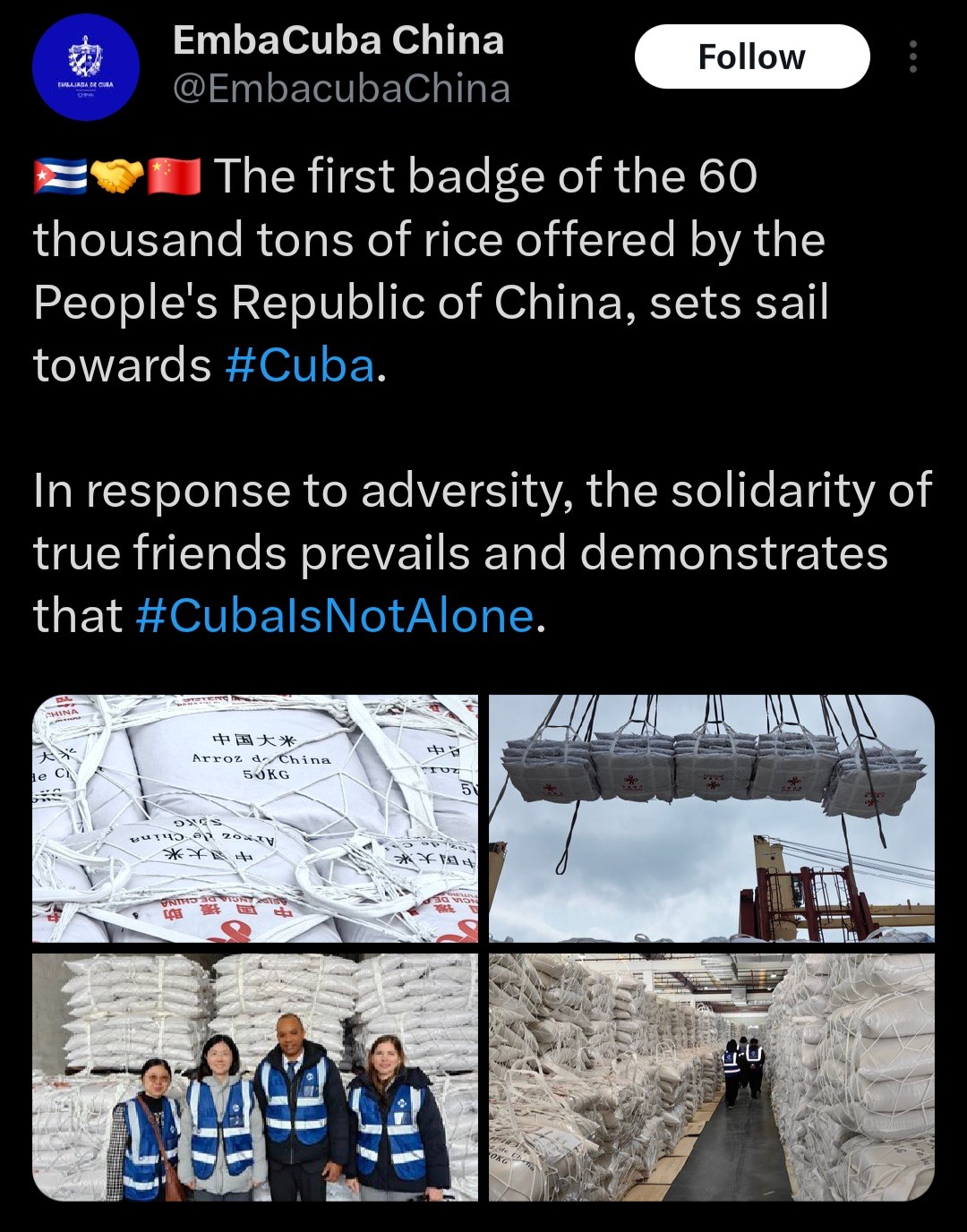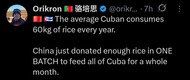 >China hace toda una operación logística para alimentar a los cubANOS <el caribeño se lo come en un mes ¿Por qué Cuba es tan mediocre? no creo que el bloqueo les prohíba plantar papas y trigo. Son literales cabernícolas kek