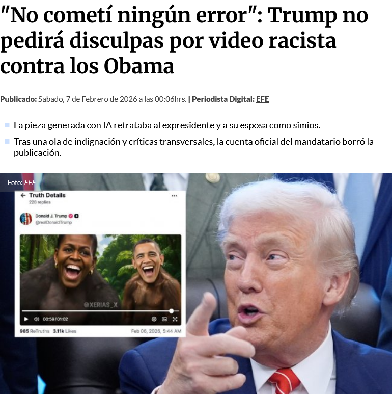 "No cometí ningún error": Trump no pedirá disculpas por video racista contra los Obama