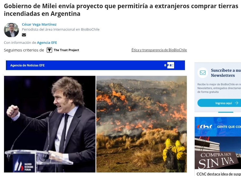 Gobierno de Milei envía proyecto que permitiría a extranjeros comprar tierras incendiadas en Argentina pronto aquí en chile