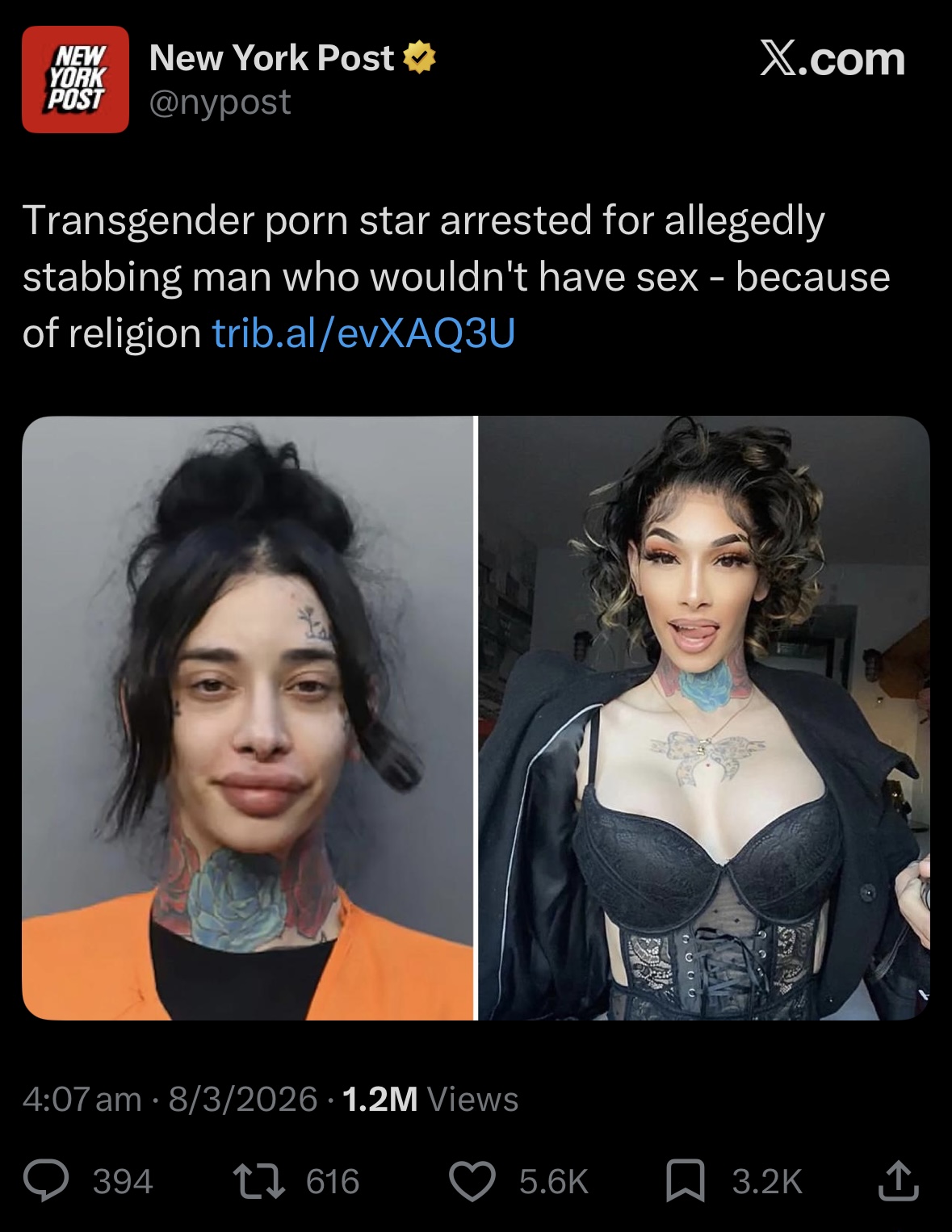 Hola perras rabínicas tranylovers >Una estrella porno trans presuntamente apuñaló a un hombre que se negó a tener relaciones sexuales por diferencias religiosas. La modelo porno transgénero La'Rose Sainte supuestamente apuñaló a un hombre que rechazó tener relaciones sexuales con la creadora de contenido para adultos porque Sainte no es judía. La víctima dijo a la policía del condado de Miami Dade que se conocieron tres semanas antes del incidente y que él invitó al Sainte a su apartamento el 19 de febrero, según los registros del arresto. Sainte, de 30 años, que tiene tatuajes en el cuello y la frente y publica videos explícitos en X y Fansly, supuestamente se enfureció cuando la víctima dijo que no tendrían relaciones sexuales porque Sainte no es judío, dijeron las autoridades. Sainte, supuestamente exigió las llaves de su auto y dinero, y cuando el hombre intentó escapar al baño, Sainte lo atacó, empujándolo al suelo y golpeándolo repetidamente en la cara, dijo la policía. El hombre escapó de su apartamento pero regresó cuando escuchó los sonidos que Sainte hacía destruyendo su casa, incluyendo un espejo, la manija de la puerta del refrigerador y dos pares de gafas de sol con un valor combinado de 300 dólares, dijeron las autoridades. Supuestamente Sainte agarró un trozo de vidrio del espejo roto e intentó apuñalar a la víctima mientras levantaba los brazos para defenderse, causándole pequeños cortes en la mano izquierda, junto con heridas faciales por el golpe, dijeron los policías. Sainte, quien también se llama Jacob Todd Pabellon según la declaración jurada, huyó pero la policía lo detuvo rápidamente y lo encontró con las llaves de la casa, el auto y la cerradura de la víctima, según las autoridades.