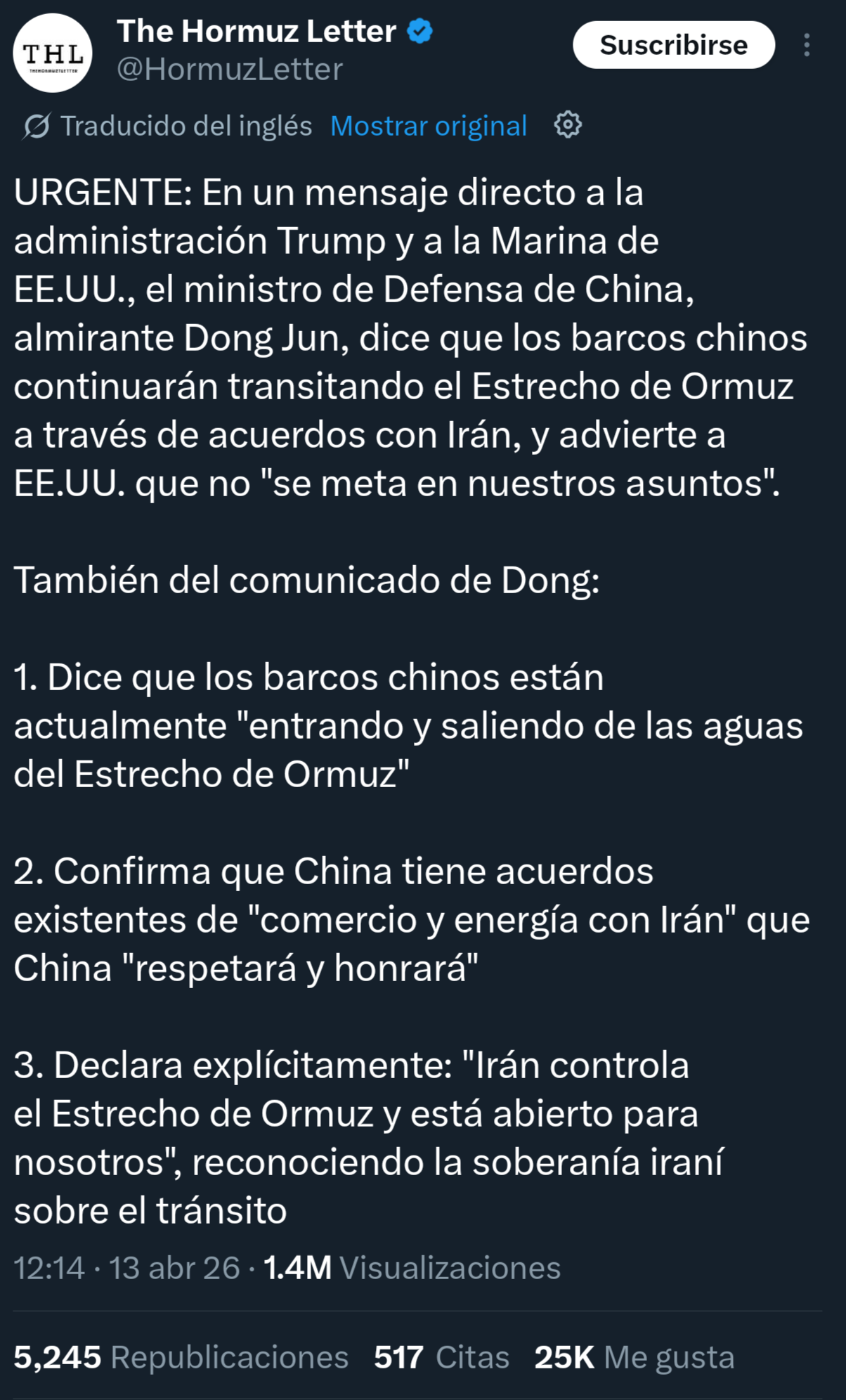 Lo más chistoso que puede pasar de esto es que China termine comprándole petróleo a EEUU/Venezuela a precio completo y que Israel y las monarquías árabes se pongan de acuerdo para construir el Canal de Ben Gurión que pasa por Gaza pero de momento usar el canal de Suez para mover petróleo desde Oriente Medio a América y de América a Asia y si, el precio subirá para la gente común pero las empresas solo verán ganancias.
