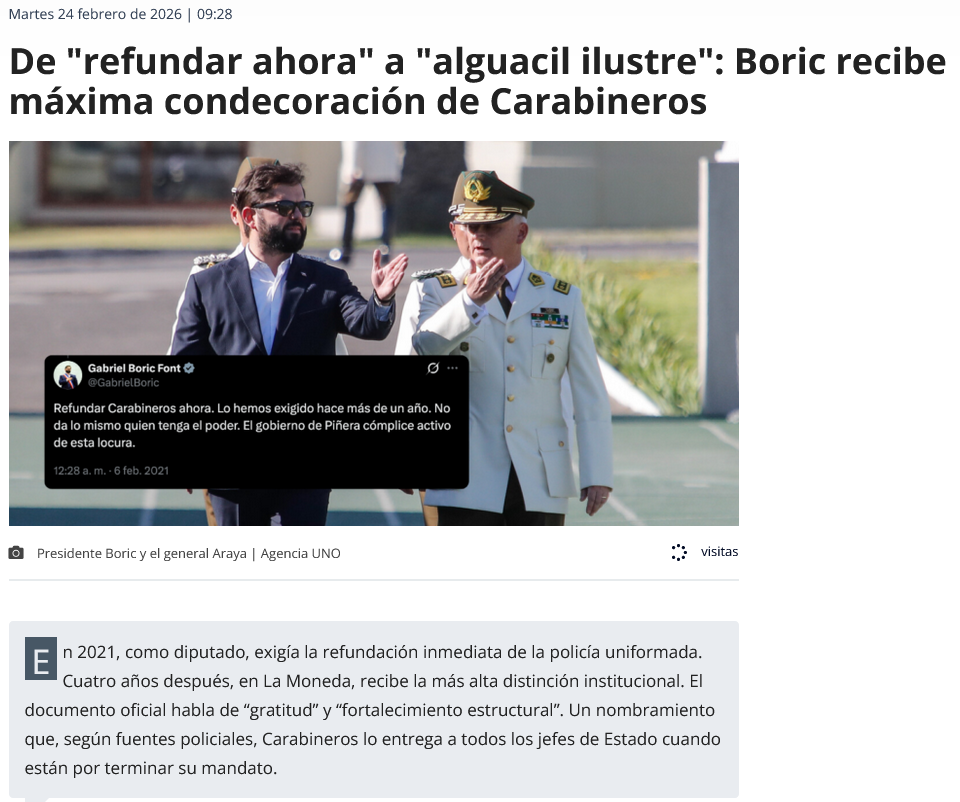 Será recordado por, entre otras cosas, ostentar el récord de dos mamarrachos fallidos al hilo en el mismo gobierno, y destruir la reputación y el apoyo a la izquierda chilena a niveles que no se veían en 100 años, y sobre este ultimo, en consecuencia, lograr que el candidato opositor (Kast) ganará logrando dos records, el ser el candidato con más votos de la historia, y ganar en todas las regiones del país.