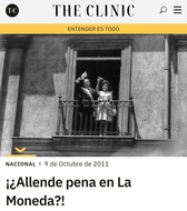 "Voces. Pasos. Llantos. Portazos. Espectros que atraviesan carabineras. Mozos que apagan luces que se vuelven a encender. Periodistas que redactan documentos con un susurro en la espalda. ¿Allende? Un palacio sin fantasmas no es palacio: Y nuestro palacio La Moneda tiene lo suyo" https://www.theclinic.cl/2011/10/09/%C2%A1%C2%BFallende-pena-en-la-moneda/